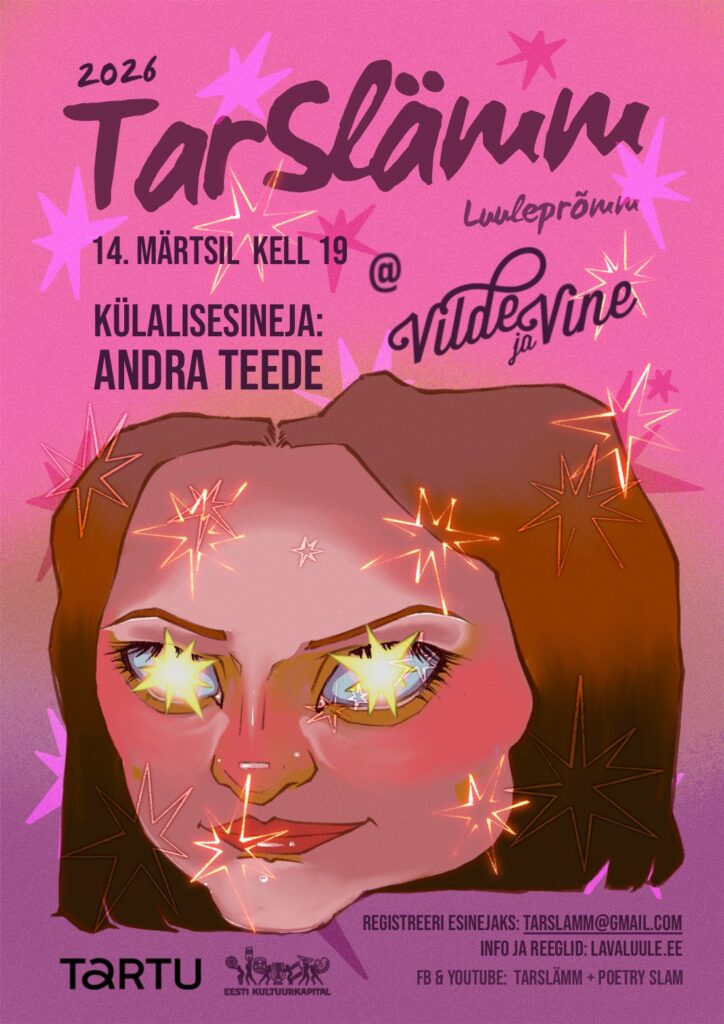 🥂 Kõiki julgeid esinejaid kosutab Vilde ja Vine ühe tasuta joogiga. TarSlämmi võitjat ootab finaal Prima Vista ajal. Säravamatele esinejatele auhinnad. ✨